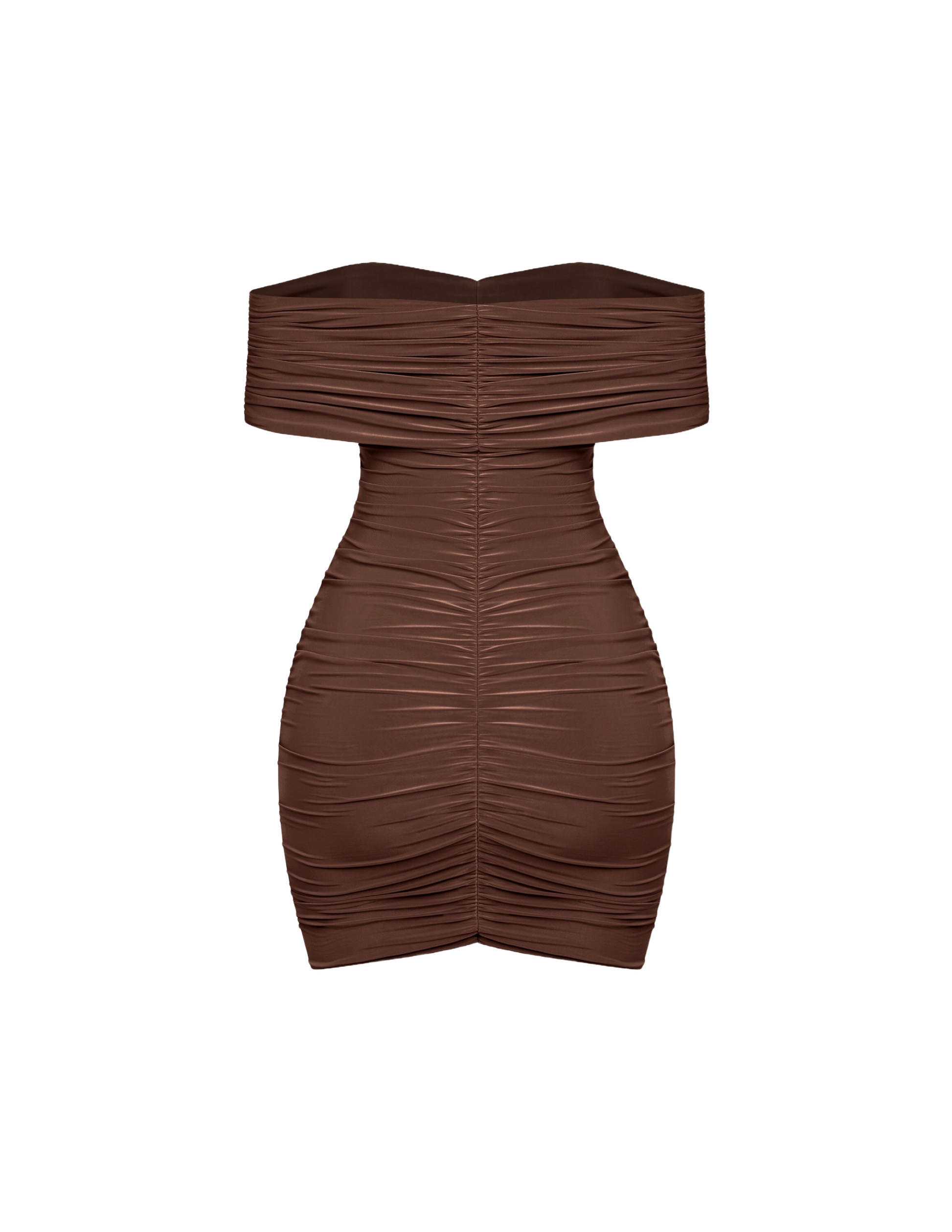 Cocoa Ruched Off the Shoulder Mini
